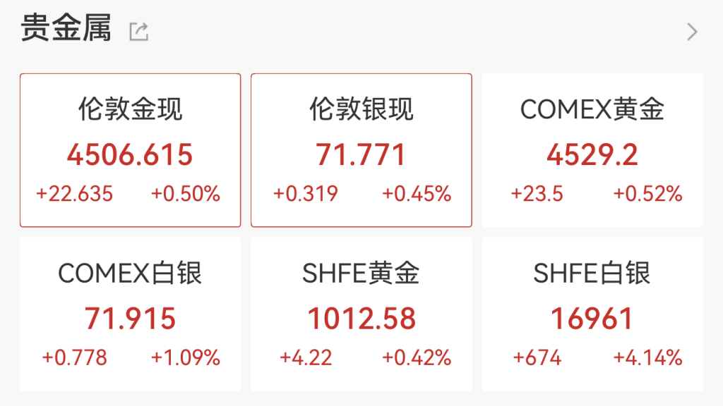 12月23日,现货黄金盘中再创历史新高,逼近4500美元/盎司。现货白银首次突破70美元/盎司。国际贵金属期货普遍上涨,COMEX黄金期货收涨1.02%,报4515美元/盎司,创历史新高;COMEX白银期货收涨4.44%,报71.61美元/盎司,创历史新高。